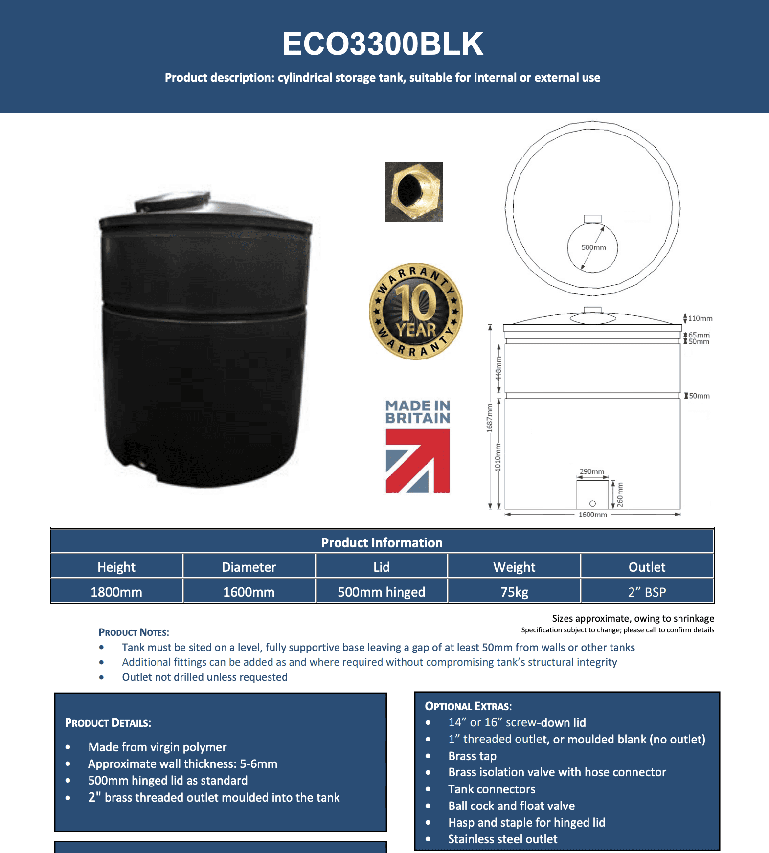 Home / Water Storage Tanks / 1200 to 6000 Litre Water Storage Tanks / 3300 Litre Water Tank 3300 Litre Water Tank Product Code: ECO3300WT Product Code: ECO3300WT Outlets: None 1″ BSP Outlet 2″ BSP Outlet Shut-off Valves: None 1″ Valve & connector £18.00 (+£18.00) 2″ Valve & connector £38.00 (+£38.00) Float Valve & Float: None 1″ - £72.84 (Including 20% VAT) (+£72.84) 2″ - £329.47 (Including 20% VAT) (+£329.47) £663.00 (£552.50) Description Experience unmatched durability with PipeTech's 3300 Litre Water Tank, perfect for both internal and external use. Ideal for domestic or commercial water storage, and rainwater harvesting. Frost-proof and crack-resistant in cold weather. Made from industrial-strength, opaque plastic to reduce algae growth. Rotationally moulded for enhanced strength and durability, offering great value and peace of mind. Diameter: 1600mm Height: 1800mm Weight: 75kg PRODUCT DETAILS: • Made from virgin polymer • Approximate wall thickness: 5-6mm • 500mm hinged lid as standard • 2" brass threaded outlet moulded into the tank BENEFITS: • Suitable for internal and external use • Frost proof; will not crack in cold • Value for money, high capacity storage • Ideal for domestic or commercial water storage • Robust, heavy duty product; industrial strength • Opaque plastic reduces algae growth in sunlight • Rotationally moulded for strength and durability • 10 year warranty against manufacturing defects Attributes MPN: ECO3300WT Condition: NEW Brand: Pipetech Product Code: ECO3300WT Delivery Timescales At Pipetech, we understand that timely delivery is crucial for your project’s success. We strive to ship your orders as quickly as possible while ensuring the highest standards of quality and service. 1. Order Processing ABS & PVC Pipe, Fittings and Valves / Drain Couplings (Next Working Day) Same day order cut-off: Orders placed before 3pm UK time on working days are dispatched the same day. Orders placed after 3pm, on weekends or on UK bank holidays are processed next working day. Metal Valves (Next Working Day) Same day order cut-off: Orders placed before 3pm UK time on working days are dispatched the same day. Orders placed after 3pm, on weekends or on UK bank holidays are processed next working day. Water Storage Tanks (3–5 Working Days) Same day order cut-off: Orders placed before 3pm are processed same day. Delivery is 3–5 working days. Orders placed after 3pm, on weekends or on UK bank holidays are processed next working day. 2. Stock & Availability ABS & PVC Pipe, Fittings & Valves / Metal Valves Most products are held in our UK warehouse ready for next-day dispatch. If an item is out of stock, we will email an estimated lead time within 1–2 hours. Immediate refund available if unsuitable. Water Storage Tanks Popular tanks are stocked in the UK and delivered within 3 working days. If out of stock, tanks are manufactured and delivered within 3–5 working days. Lead time emailed within 1–2 hours. 3. Delivery Timescale Enquiries For an approximate delivery timescale on any product, please email sales@overflowscreens.com. We aim to reply within one hour.